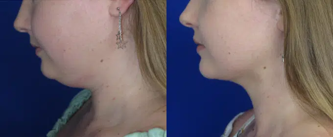 This is a 20 year old female with some fullness to the area under her chin. She underwent chin liposuction under local with sedation anesthesia and is very happy with her results. Note the disappearance of the double chin and the contour created along the jawline and neck line.